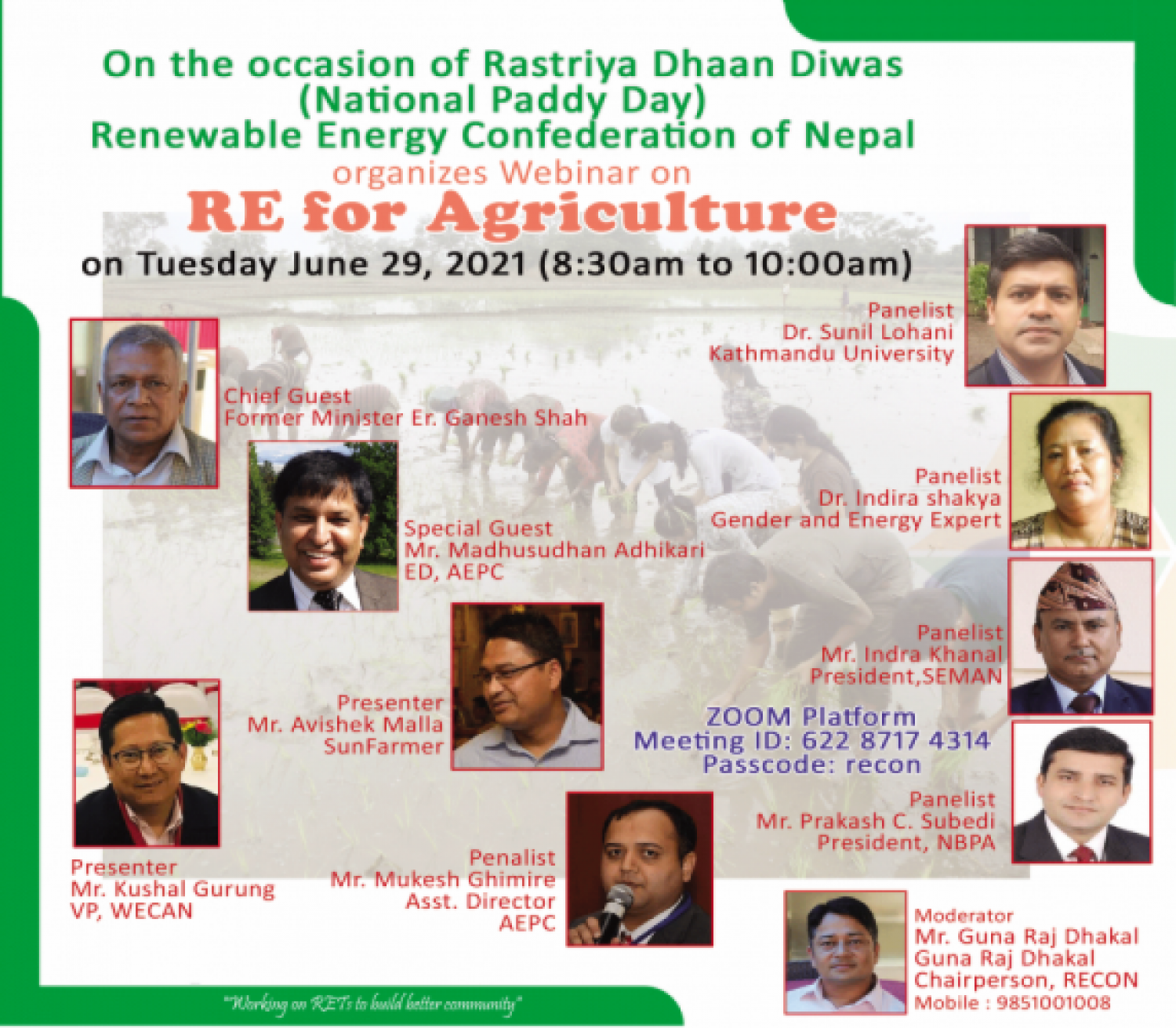 Renewable Energy Confederation of Nepal (RECON) is a common forum of associations of private sector involved in supply and delivery of alternative energy systems and services and NGOs involved in promotion of alternative energy in Nepal.